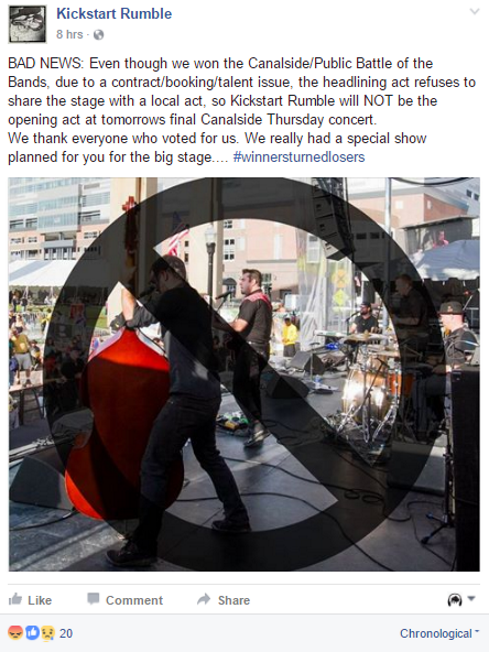 Kickstart Rumble first informed their fans via Facebook with a message shortly before 8 p.m. that said “BAD NEWS: Even though we won the Canalside/Public Battle of the Bands, due to a contract/booking/talent issue, the headlining act refuses to share the stage with a local act, so Kickstart Rumble will NOT be the opening act at tomorrows final Canalside Thursday concert.