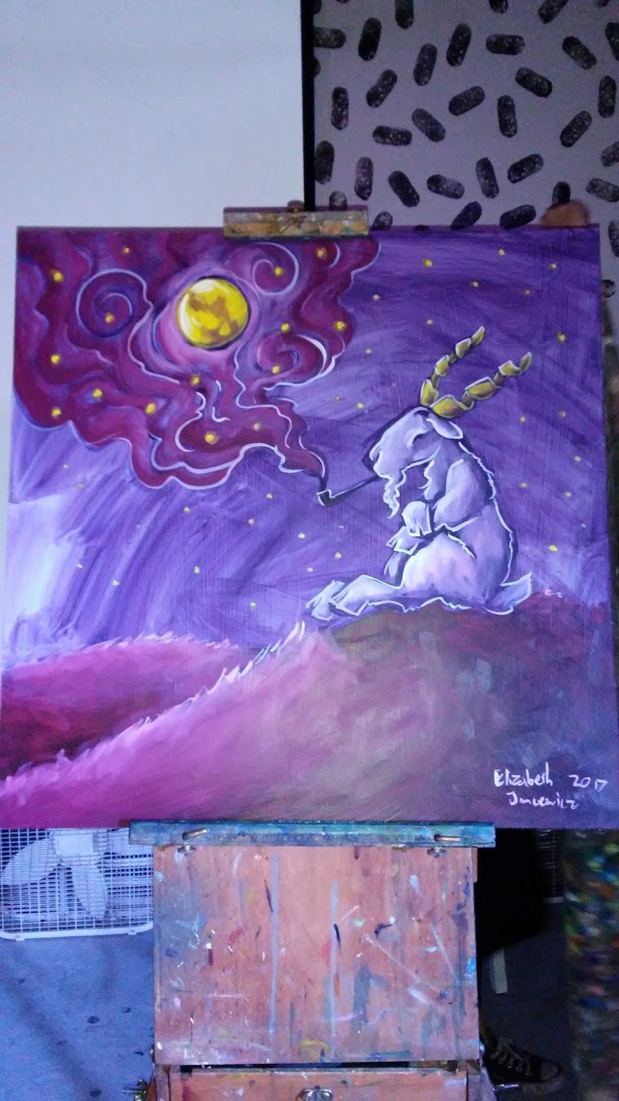 Watching someone paint live created an atmosphere like no other concert I’ve been to. Pocket Vinyl’s performance would have been memorable without the painting, but Elizabeth’s contribution to the performance made the evening extraordinary. She may have been speed-painting (a typical Pocket Vinyl performance is usually closer to 45 minutes or an hour), but you couldn’t tell from the result. Her finished painting (see photo insert) was whimsical, soothing and as impressive as anything you’d find at indie galleries like CEPA or Hallwalls. The experience of watching Elizabeth do something as simple as adding little dotted stars to a sky was relaxing to watch, and seeing her creative process an artform in itself. Some might ignorantly refer to Stevenson as a solo act with an artist on stage, but it couldn’t be further from the truth; Elizabeth’s painting carries a calm, steady pulse that paces the show and perfects the atmosphere. As is Pocket Vinyl’s tradition, the painting was auctioned off to the crowd at the end of the night. Amazingly, after 700+ shows, each painting is a distinct, one-of-a-kind original.