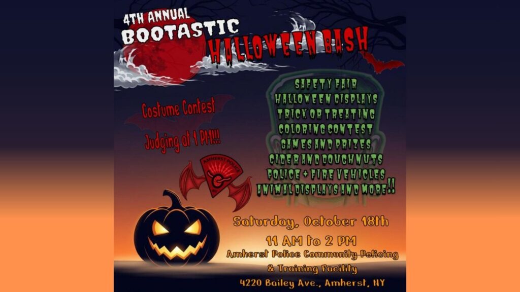 Join the Amherst Police Department for the 4th Annual BOOTASTIC HALLOWEEN BASH on Saturday, October 18th from 11 AM – 2 PM at the Amherst Police Community Policing & Training Facility (4220 Bailey Ave.)