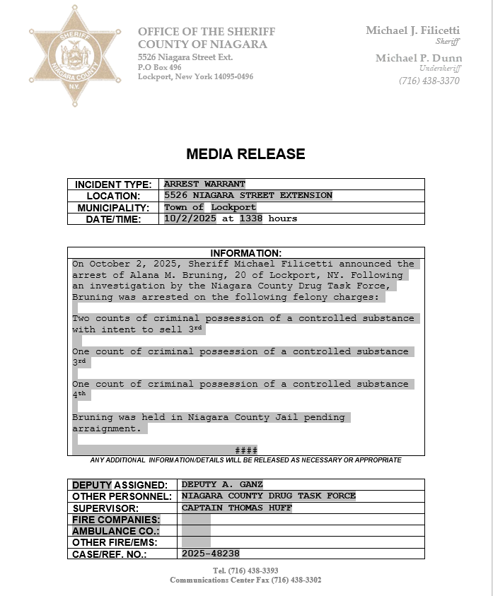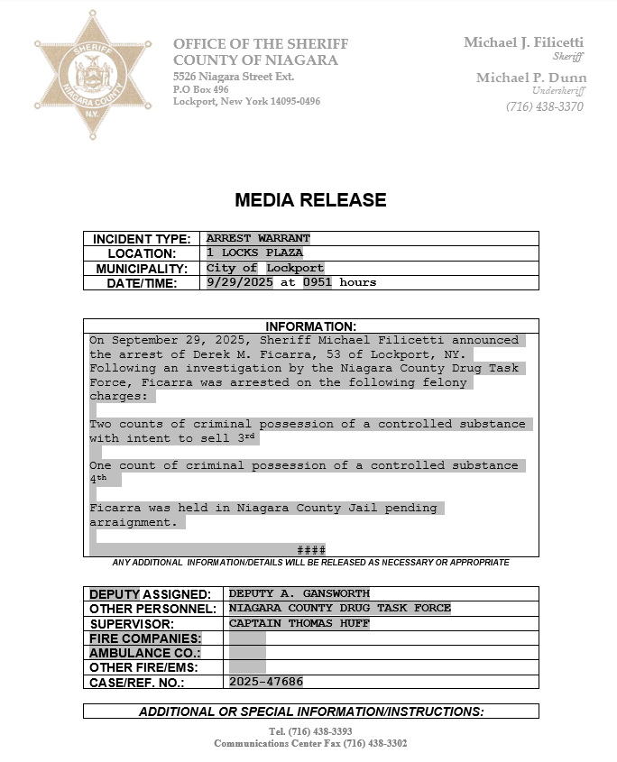 On September 29, 2025, Sheriff Michael Filicetti announced the arrest of Derek M. Ficarra, 53 of Lockport, NY.