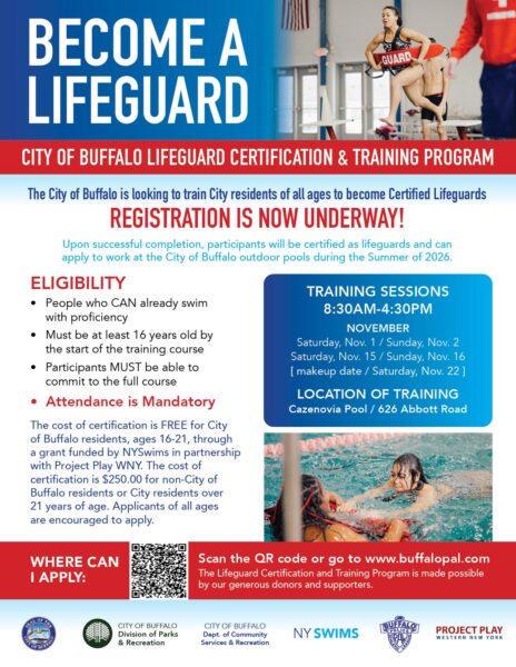 BUFFALO – Mayor Christopher P. Scanlon, in partnership with the City of Buffalo Division of Parks and Recreation and the Police Athletic League of Buffalo, is calling on interested residents of all ages to register now for the November 2025 Lifeguard Certification and Training Program in the City of Buffalo. The dates of the next training course are as follows: Saturday, November 1st, Sunday, November 2nd, Saturday, November 15th and Sunday, November 16th, with a makeup date of Saturday, November 22nd. All classes will take place at the Connors, Kait, Harrity Memorial Pool/Cazenovia Pool, located at 626 Abbott Road, from 8:30 a.m. to 4:30 p.m.